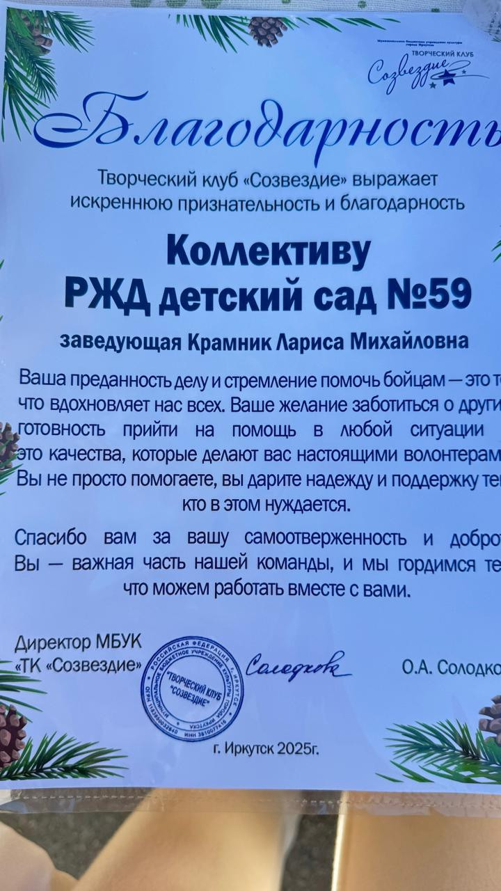 19 сентября РЖД детский сад № 59 стал активным участником благотворительной акции "СВОих не бросаем". Мероприятие было организовано Муниципальным бюджетным учреждением культуры города Иркутска Творческим клубом "Созвездие". Цель акции – сбор средств для поддержки российских военнослужащих, находящихся в зоне Специальной военной операции.