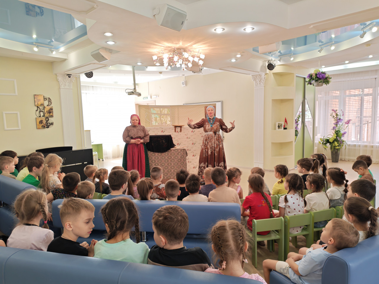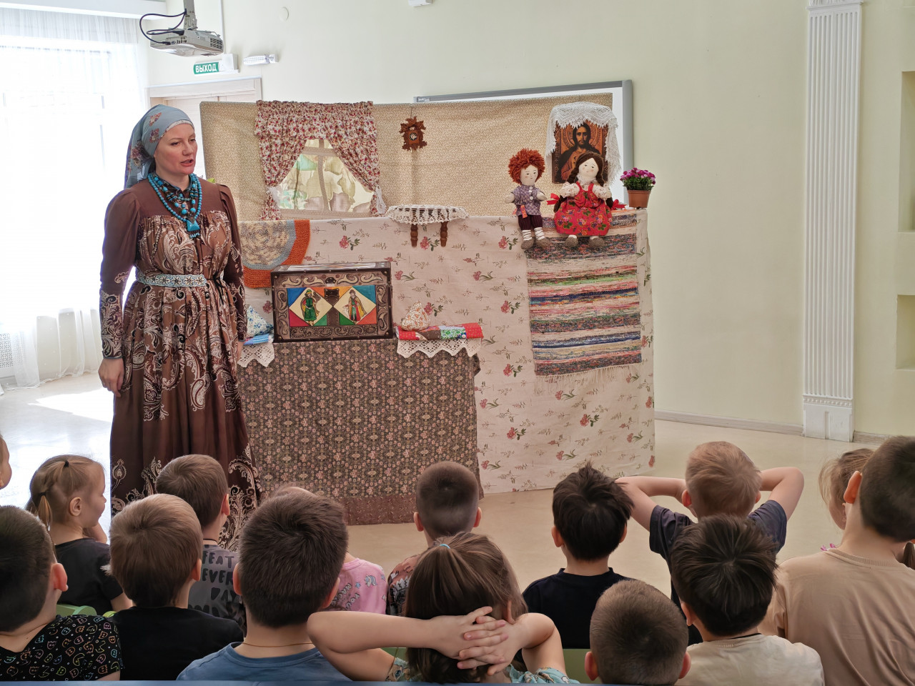 Юные зрители познакомились с историей о пасхальном дне в уютной Ситцевой деревеньке, где живут кукольные дети Егорка и Маняша, их ласковая няня, добрая тётушка и домашние питомцы — поросёнок Борька, петух Петя и коровка Зоря.