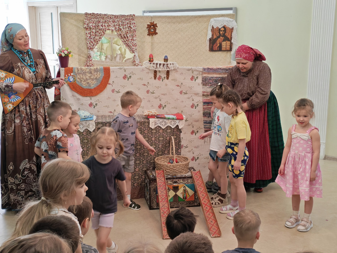 В дни Светлой Пасхи для ребят старших, подготовительных и средних групп состоялся показ спектакля фольклорного театра «Ситцевая деревенька» — «Пасхальный день».