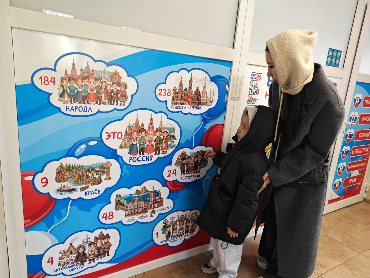 У входа в четвёртый блок нашего детского сада оформлен целый уголок — стена, посвящённая Году единства народов. Это не просто яркое оформление, а уникальная возможность для детей в игровой и наглядной форме познакомиться с культурой, традициями и ценностями единства.