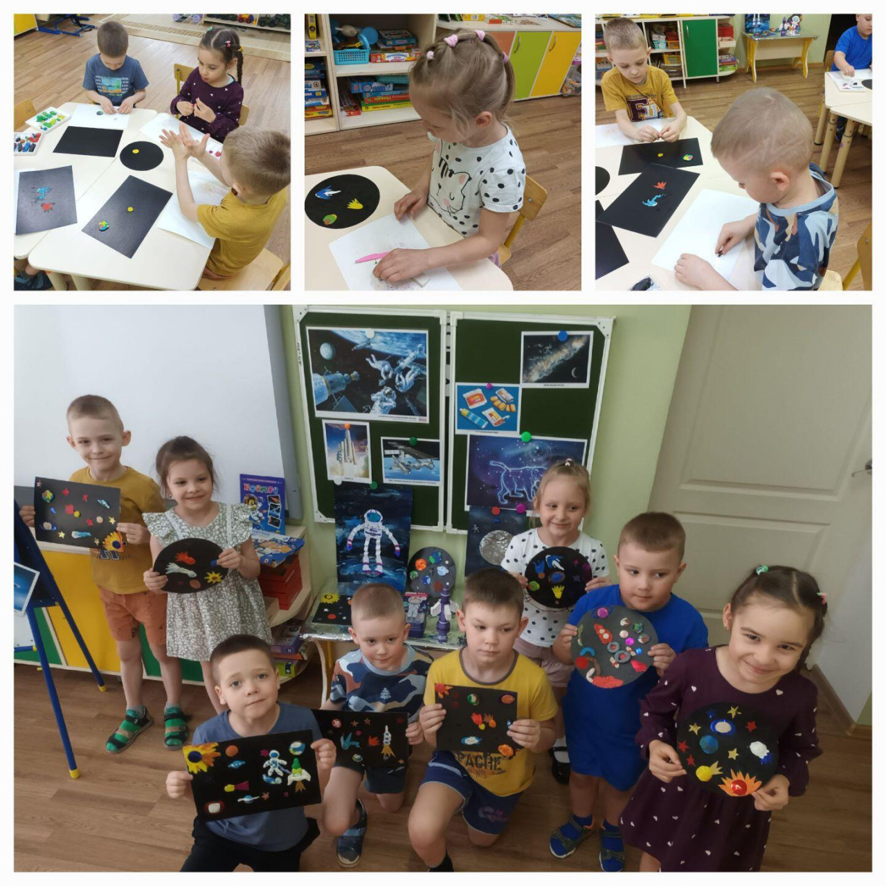 Ребята нарисовали рисунки о космосе и космическом полёте и сделали необычные картины «В космосе» с помощью пластилинографии.